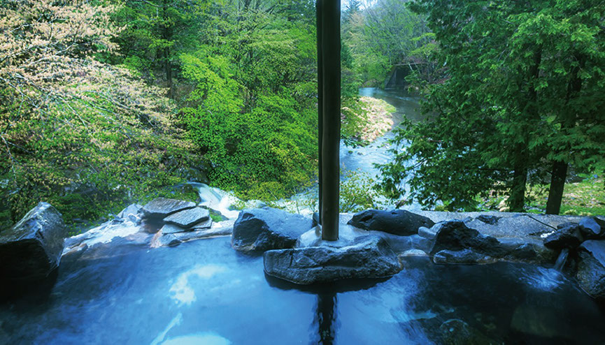 弱酸性のさらりとした泉質で、美人の湯としても誉れ高く、お肌のつるつる感を楽しんで頂けます。渓流の力強い音、眼前の大木に迫られるようなダイナミックさ。