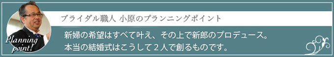 演劇関係にも伝手のある小原は、劇団が公演を打って観客を喜ばせるのと、結婚式でゲストをもてなすのは、同じ考え方です。