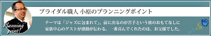 そこに小原が食いつきました。家族で婚礼 食事会だけでは時間の設定が難しいからパーティー中、ジャズのライブをやりましょう。と 提案をしました。